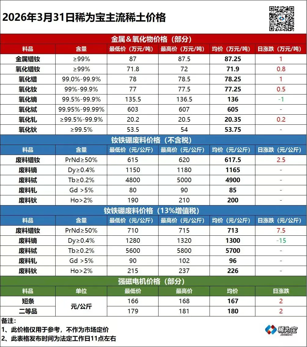 >【稀土行情】2026年3月31日稀土价格汇总(仅供参考)