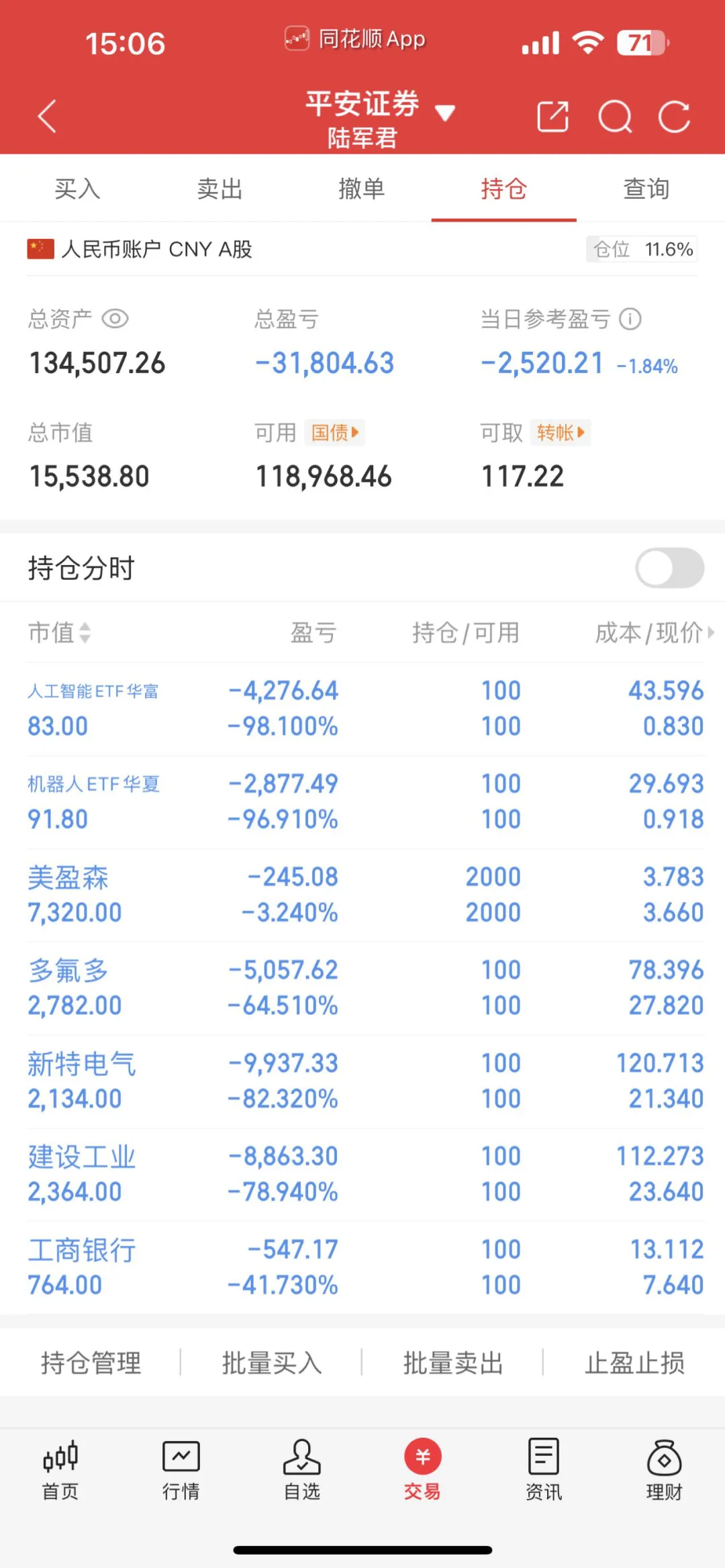 今日操作:卖出建设工业,操盘线眼看着就破了,果断卖出🔪同时还看了机器人在低位准备进,但是5分钟级别是死叉,还好没进,尾盘果然走弱。还看了工商银行,形态是老鸭头,但是已经在高位,并且两根阳线,确实没有进的机会,果然,尾盘就走弱了,如果是十字星或者小阳线我就进了,这段时间银行真的很强,看来大盘要麻烦了……银行尾盘弱,也可能暗示明天大多数股会走红线,具体就不知道,先空一空吧
