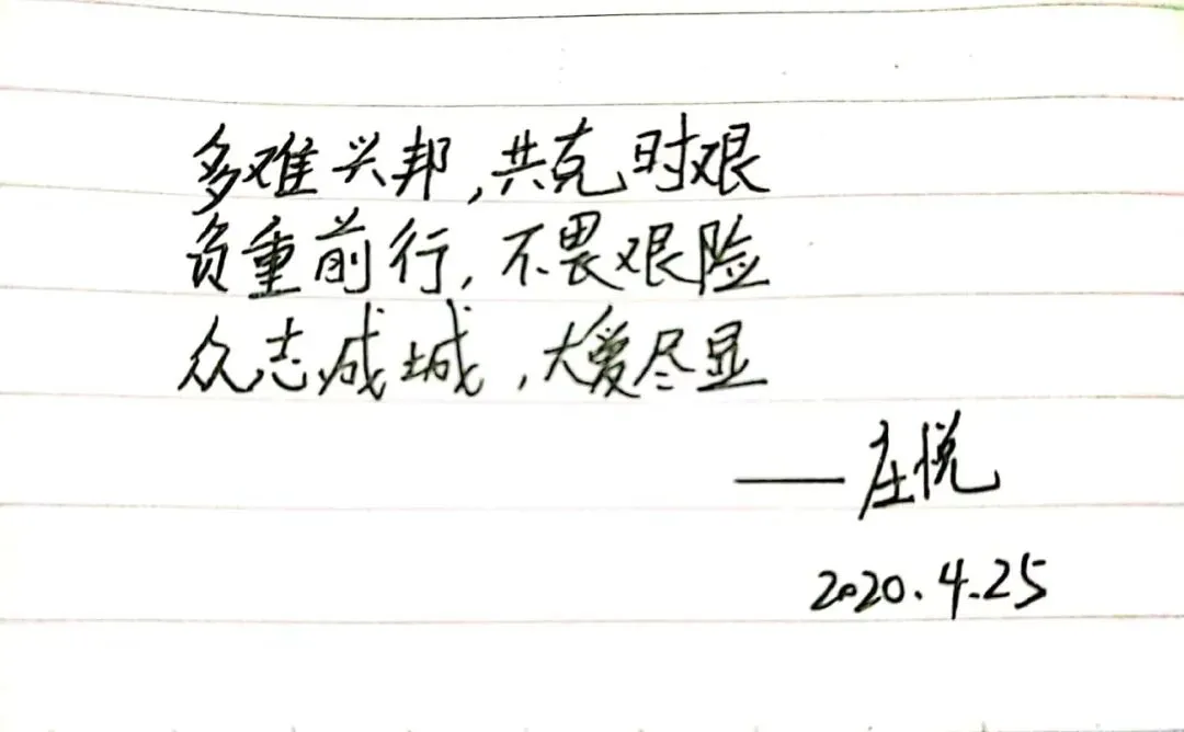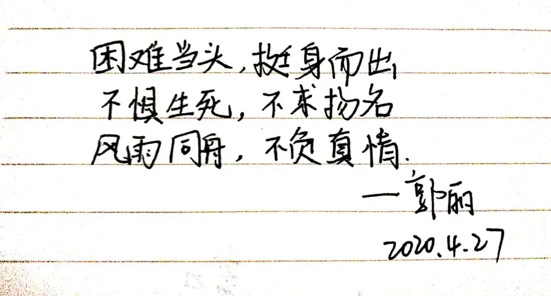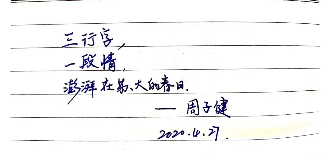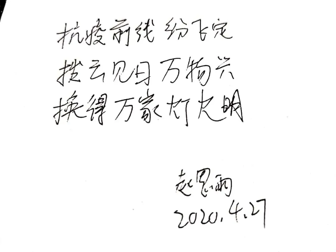 诗歌的发展历史悠久,在中华民族文明传承中有着重要地位,尽管时代变迁但是诗歌仍然是我们中华儿女表达情感的重要的方式之一。今天我们支部所有党员同志用三行情诗的方式,向战役中的英雄、美丽的母校、伟大的祖国表达自己心中的敬意和祝福,在泼墨挥毫间见真情,在师生共写美好祝福中励志再出发。下面,让我们一起来欣赏一下各位党员同志们的三行情诗。