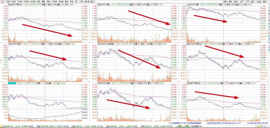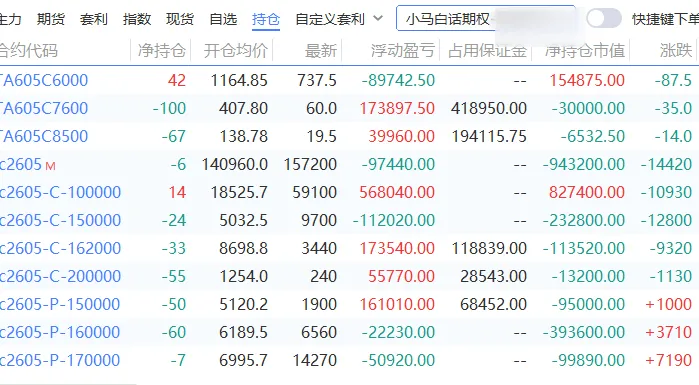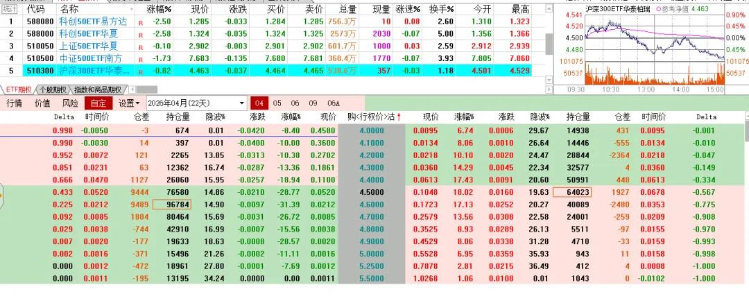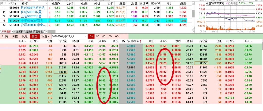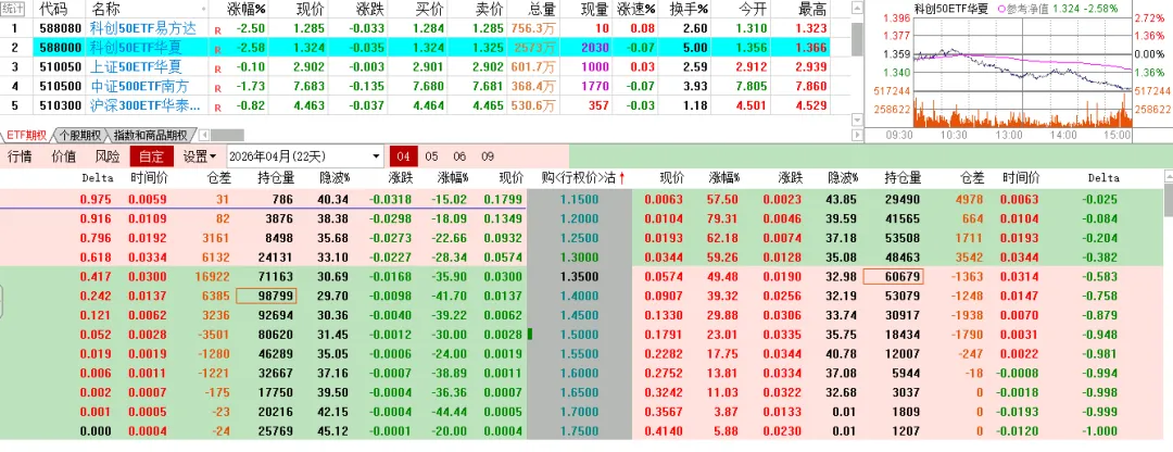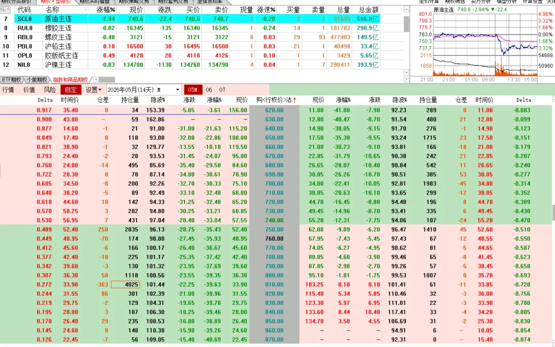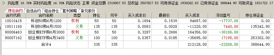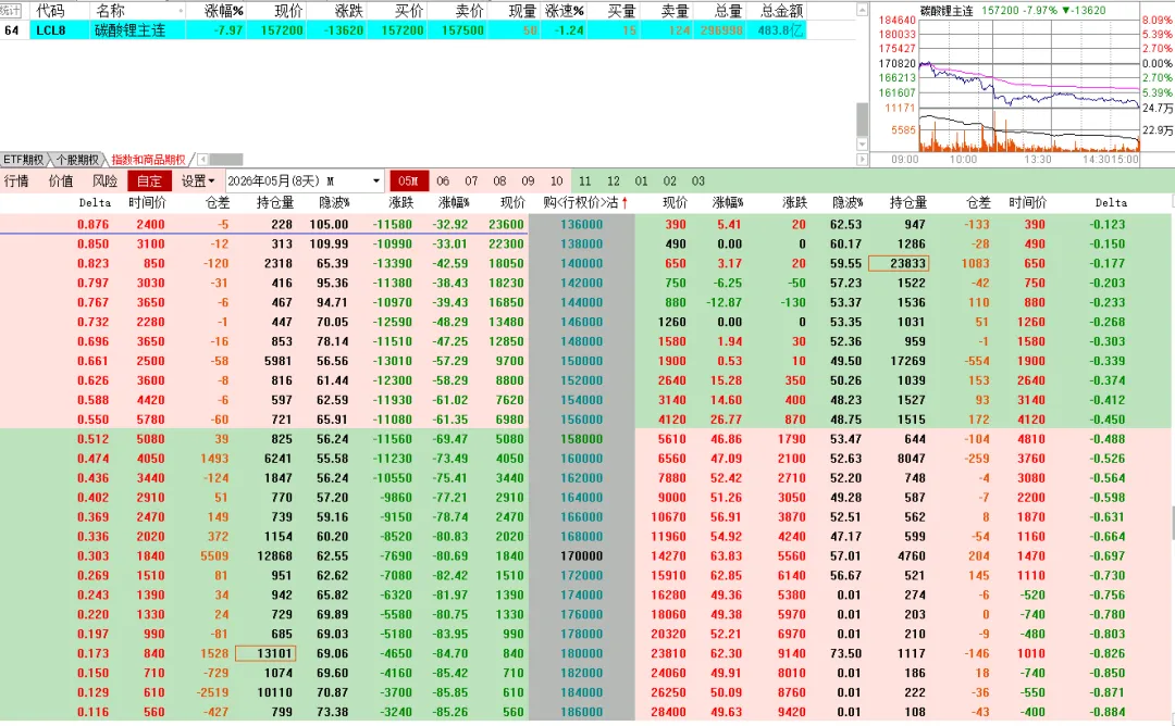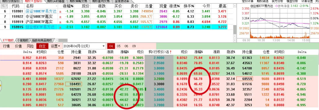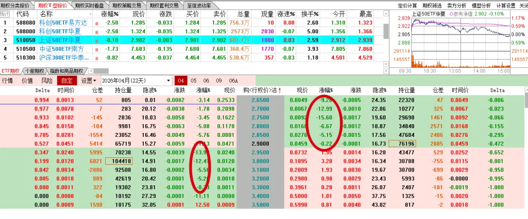 碳酸锂前面长得挺好,今天一根阴线回落了一万多点,回到中期均线附近。下面是原油期权走势,肯定是卖方赚钱,但是之前的担惊受怕,谁还敢做这个品种呢。碳酸锂的虚值认购啪一下回到原点,认沽不同程度上涨。ETF这边虽然是比例价差,但还是个多头持仓的,今天一个下跌,买购纷纷浮亏,卖购的那部分,还是不太够的 。