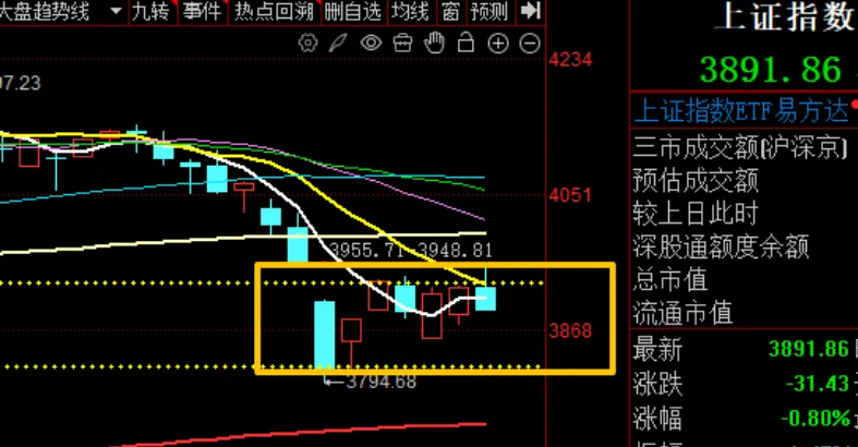 今天果然如此:早盘平开冲高,到3950点(箱体上沿)就冲不动了,随后震荡下跌,尾盘收在全天最低点,典型的冲高回落。