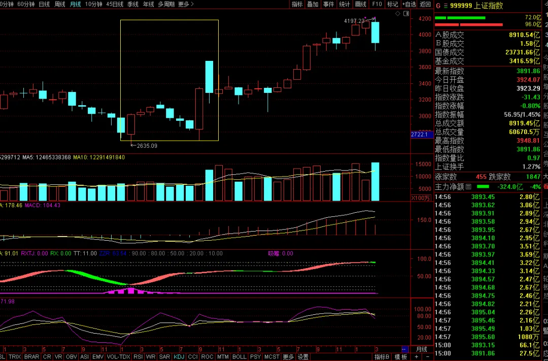 从图形上,2024年9月24日之后,在十一国庆节经过一番抖音、快手、小红书、视频号等等自媒体在假日期间大肆宣传的效果下,高开超过10%,接下来就是低走,当年那一个月比较惨烈,那是在行情刚刚启动之初,和现在是两个状态。本月是我们大A从3200牛到4197之后首次大阴线下跌,平均个股回撤接近25%,个别的已经出现了超过40%的下跌幅度了。