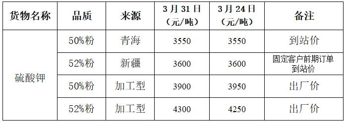 本周硫酸钾市场价格小幅波动。水盐系产品中,新疆罗钾52%粉硫酸钾供固定客户前期订单,本周到站价3,600元/吨,与上周持平;青海50%粉硫酸钾供固定客户订单,本周到站价3,550元/吨,与上周持平。加工型硫酸钾中,曼海姆50%粉硫酸钾出厂均价3,900元/吨,较上周降50元/吨;曼海姆52%粉硫酸钾出厂均4,300元/吨,较上周涨50元/吨。