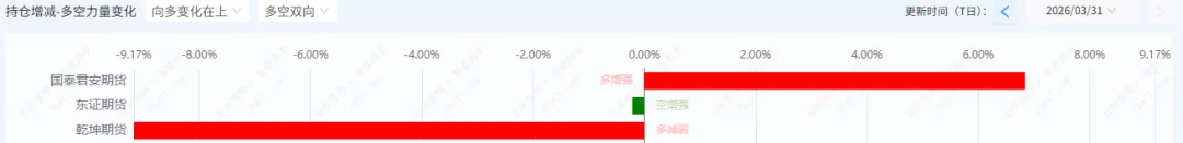 天然橡胶:市场中机构空头力量占据绝对优势,国泰君安系净空单市值超20亿元,而多头阵营持仓分散且规模小,导致价格上行阻力巨大,多头难以突破。