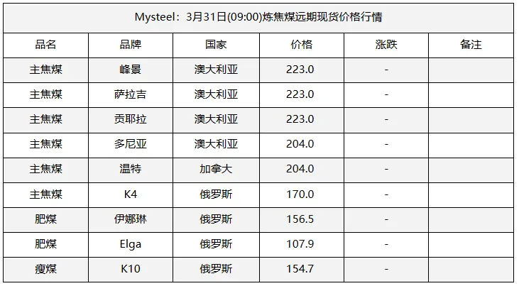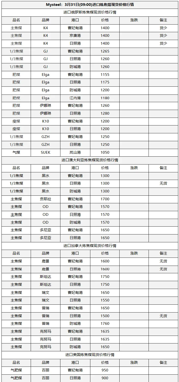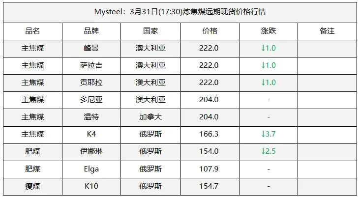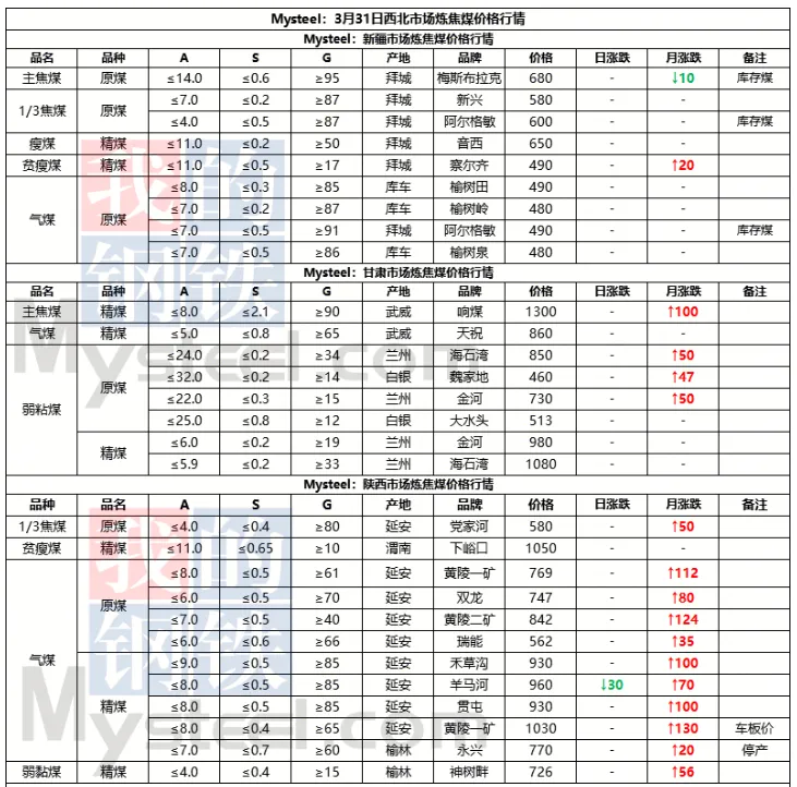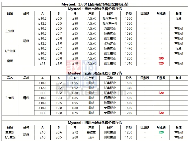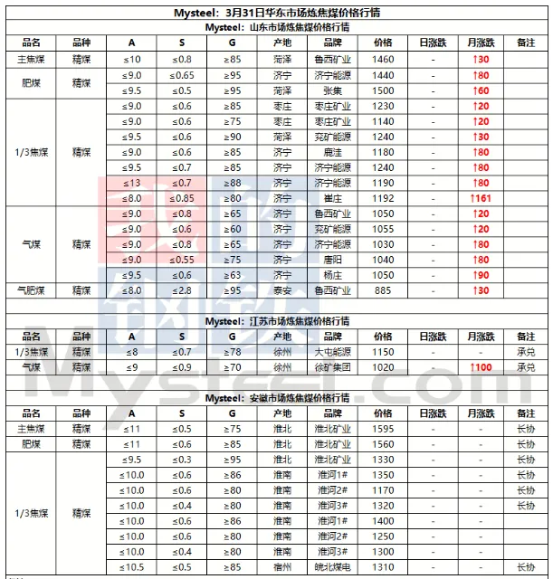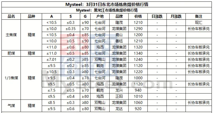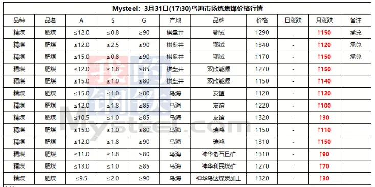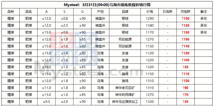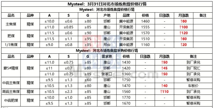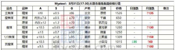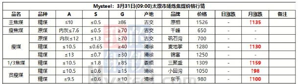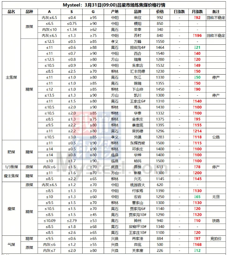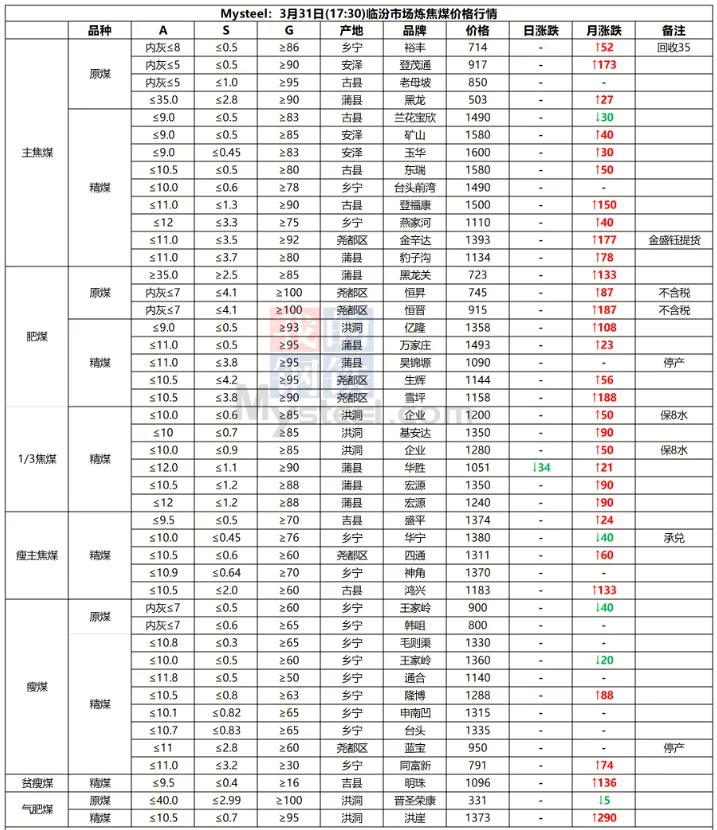31日临汾市场炼焦煤价格偏强运行。供应及市场成交方面,区域内多数煤矿生产基本正常,且近期煤矿签单率良好,部分煤矿库存偏低;市场成交方面,近期多数煤种价格上浮明显,部分洗煤厂及贸易商情绪转向谨慎,高价资源成交情况较上周也有所收紧;需求方面,上周铁水日均产量恢复至231.09万吨,环比增2.94万吨,焦炭一轮提涨预计于4月1日落地执行,后续下游对原料端的支撑,需持续关注终端钢材价格及去库情况是否可以明显改善。综合来看,预计短期内临汾市场炼焦煤价格将偏强运行。