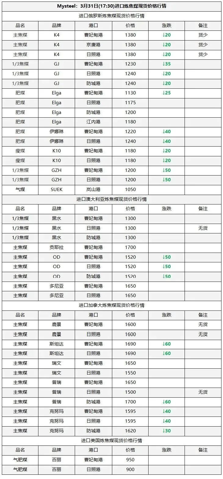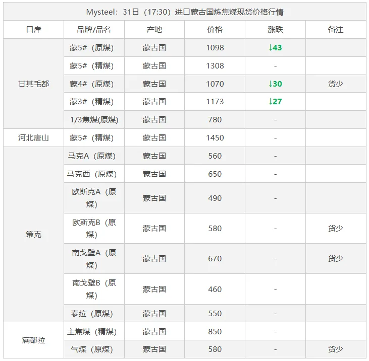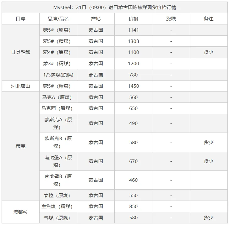 31日太原市场炼焦煤价格暂稳。上周炼焦煤价格涨势明显,市场成交氛围表现积极,焦炭首轮提涨也逐步落地。不过由于高煤价难以顺利传导,市场风险偏高,焦企接受意愿走低,部分煤种成交价格开始走弱,短期来看部分高价煤种有小幅回落风险。