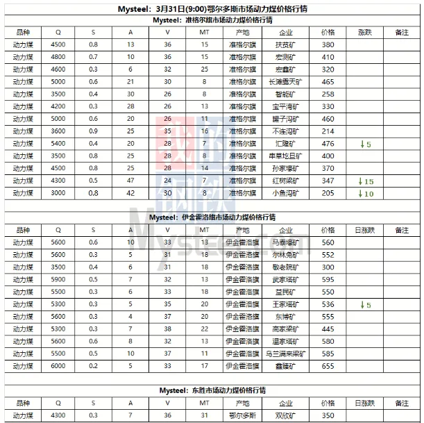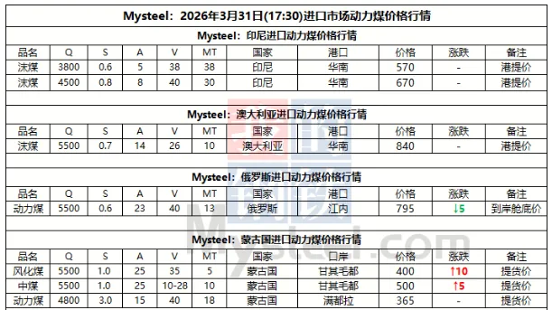 31日进口市场动力煤价格暂稳运行。国际市场上,印尼方RKAB审批陆续落地叠加假期结束生产供应正在恢复,市场活跃度有所提升,现印尼Q3800巴拿马船FOB实际成交围绕61-61.5美元/吨浮动;而东南亚等国气温逐步上升,对高卡煤需求有所增加,澳煤挺价意愿较强,现澳煤Q5500大船FOB报价在85-86美元/吨,较上周上涨2美元/吨不等。国内市场上,目前处于用煤淡季,沿海电厂日耗低位运行,终端库存压力较小,因而对高价进口煤采购意愿较低;化工、建材等非电需求虽有托底但增量有限,市场成交寥寥。短期内进口煤价或将维持震荡态势,后续重点关注印尼货源释放情况及内贸煤价变动情况。