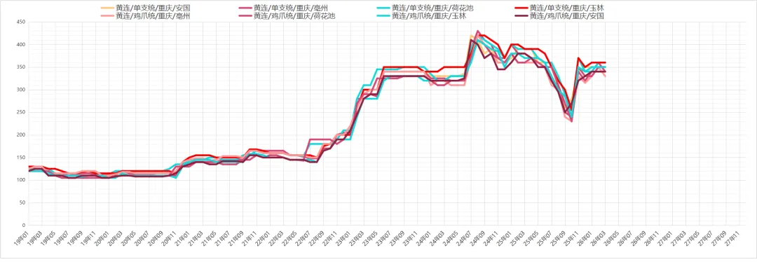 黄连价格小幅上升,近日有商寻货,货源走销市场不及产区,且多以陈货为主,现四川鸡爪统货价格在340-350元。