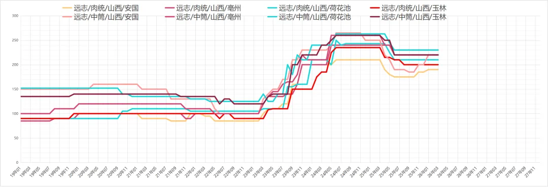 远志货源正常购销,今年春季新货产出量不大,加上库存薄弱,导致行情依然在高位运行,现市场远志筒一般统货190-200元,好统货220-230元,小选250-260元,大选报价在280-300元之间。