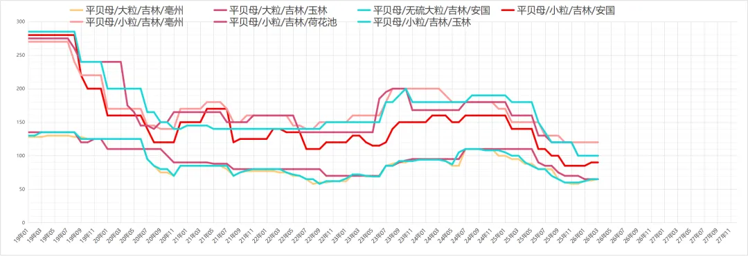 平贝母价疲,近期货源走动依然不理想,行情暂无明显波动,大贝价格在60元上下;大中贝68-70元;小贝115-120元之间,后期仍需要良好的消化空间。