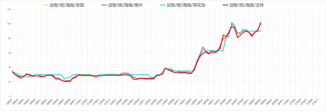 益智行情小幅回落,产新期渐近,加之市场近阶段走销量下降,现统货价格在90-93元之间,短期内行情仍难平静。