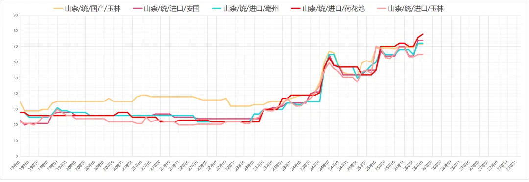 山柰行情低迷,近期市场货源走动依然不见好转,目前市场滞留货源较丰,加之缺乏实际需求拉动,国产货价格在75元;进口货66-67元。