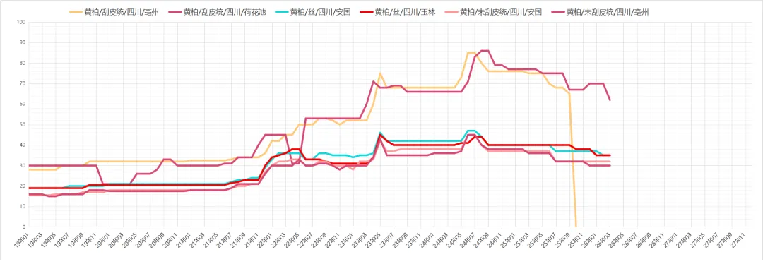 黄柏行情较弱,商家按计划采购,目前双面黄丝价格在65-70元之间,带皮的35-37元不等,经营商家手中货源有量。