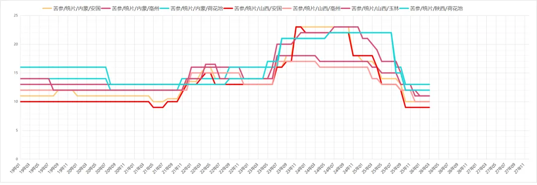 苦参行情低迷,商家购进积极性不高,货源走动缓慢,目前小片价格在8-8.5元之间,统片11-12元,后市利好有限。