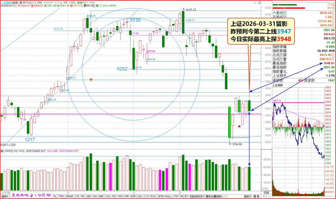 昨日我们预判今日“看跌防涨”,并明确指出上方第二压力位在3947点。今日盘面走势再次验证了量学预报的精准度: