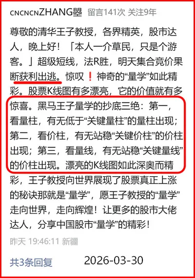 新疆网友“ZHANG曌”留言:「本人一介草民,只是个游客。」超级短线,法R胜,明天集合竞价果断获利出逃。惊叹❗️神奇的“量学”如此精彩。股票走势图有多漂亮,它的价值就有多惊喜。黑马王子量学的抄底三绝: