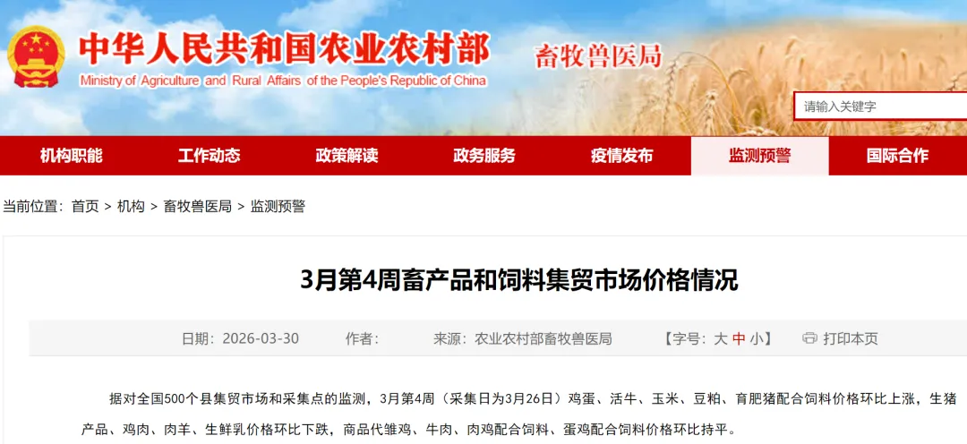 据对全国500个县集贸市场和采集点的监测,3月第4周(采集日为3月26日)鸡蛋、活牛、玉米、豆粕、育肥猪配合饲料价格环比上涨,生猪产品、鸡肉、肉羊、生鲜乳价格环比下跌,商品代雏鸡、牛肉、肉鸡配合饲料、蛋鸡配合饲料价格环比持平。生猪产品价格。全国仔猪平均价格25.42元/公斤,比前一周下跌3.0%,同比下跌33.3%。天津、内蒙古仔猪价格上涨,福建、江苏、广西、广东、江西等26个省份仔猪价格下跌,青海价格持平。华北地区价格较高,为26.17元/公斤;华东地区价格较低,为24.71元/公斤。全国生猪平均价格10.68元/公斤,比前一周下跌3.3%,同比下跌29.8%。全国30个监测省份生猪价格全部下跌。西南地区价格较高,为11.79元/公斤;东北地区价格较低,为10.06元/公斤。全国猪肉平均价格21.52元/公斤,比前一周下跌2.2%,同比下跌17.8%。全国30个监测省份猪肉价格全部下跌。华南地区价格较高,为24.45元/公斤;东北地区价格较低,为18.23元/公斤。