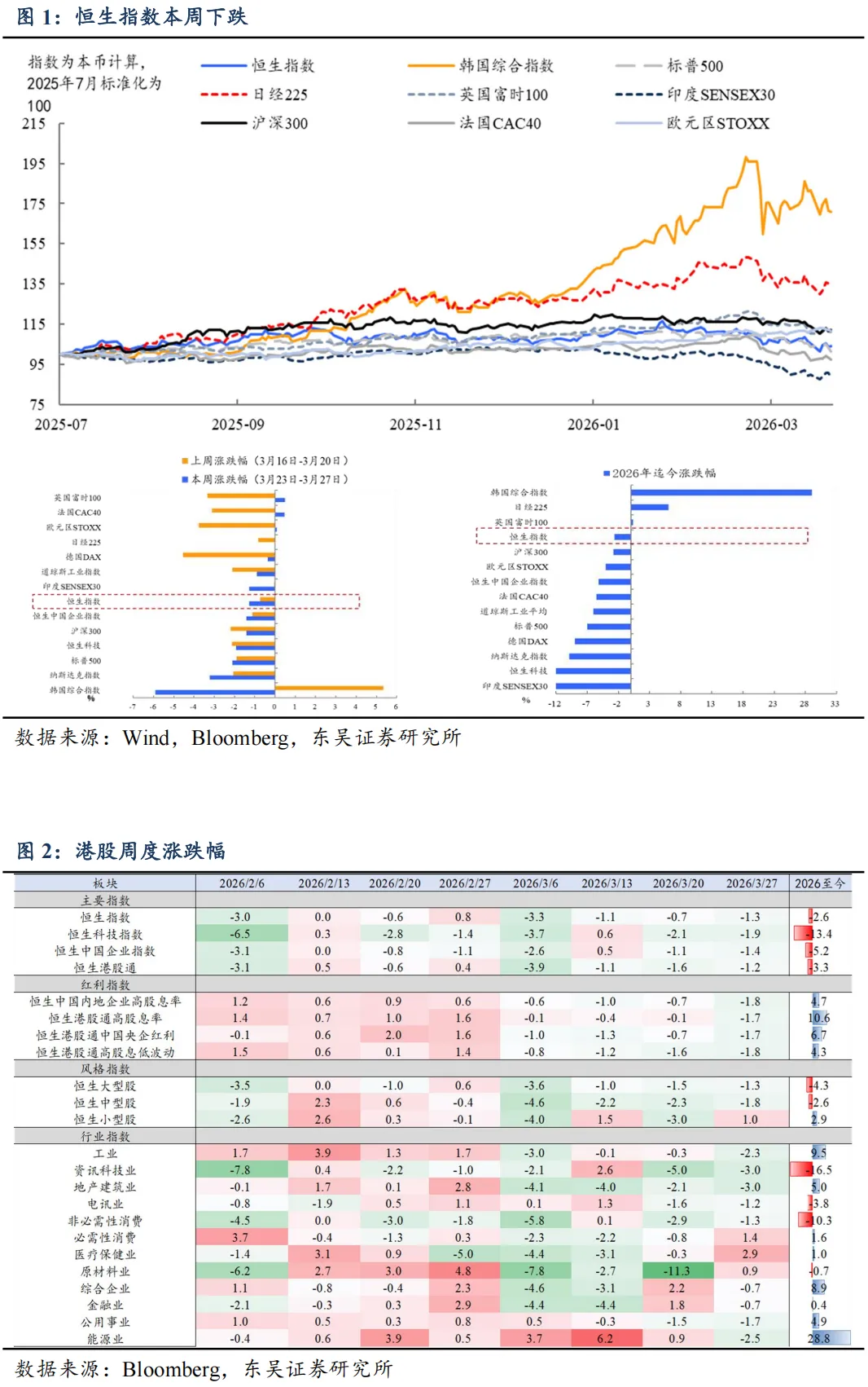 本周回顾(2026/3/23-3/27):全球主要市场普遍走弱,涨幅居前的为英国富时 100,法国 CAC40,欧元区 STOXX50,跌幅居前的为韩国综合指数,纳斯达克指数,标普 500 指数。港股全线下跌,恒生科技下跌 1.9%,恒指下跌 1.3%,恒生中国企业指数下跌 1.4%。行业上,医疗保健业(+2.9%)、必需性消费(+1.4%)、原材料业(+0.9%)领涨;资讯科技业(-3%)、地产建筑业(-3%)、能源业(-2.5%)领跌。