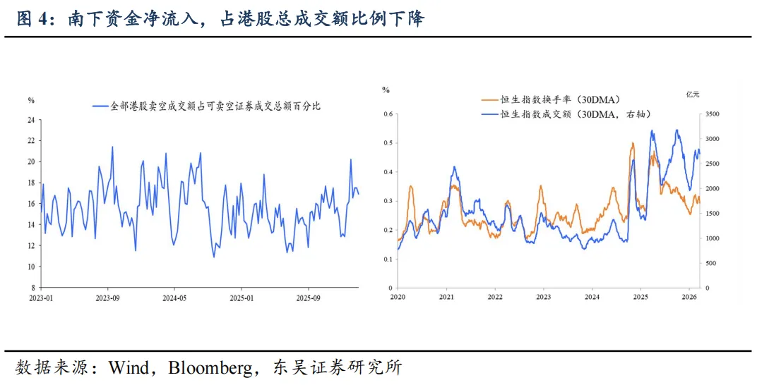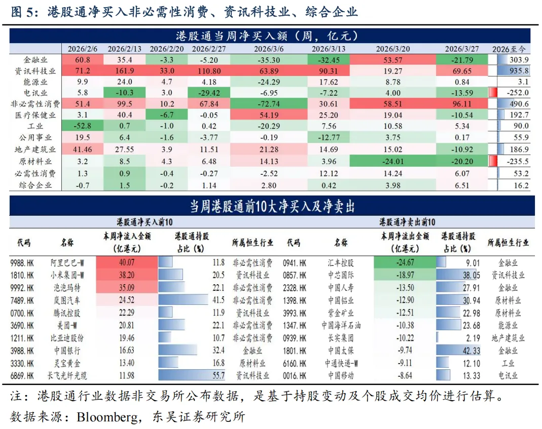 南向资金净流入。本周净流入 251 亿港元,较上周增加 314 亿港元。港股通成交额占全部港股成交从上周 41%降至本周 38%。行业方面,净流入:非必需性消费、资讯科技业;净流出:原材料业、金融业。个股方面,净买入 TOP:阿里巴巴、小米集团、泡泡玛特。