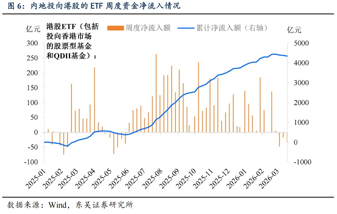 本周内地投向中国香港市场的 ETF(港股通+QDII)净流出。总规模减少至 4345.3 亿元,减少 33.4 亿元。其中港股通 ETF 净流出 39.7 亿元,QDII ETF净流出 2.5 亿元。港股宽基净流出 4.7 亿。净流入行业主题:消费。