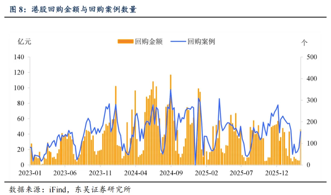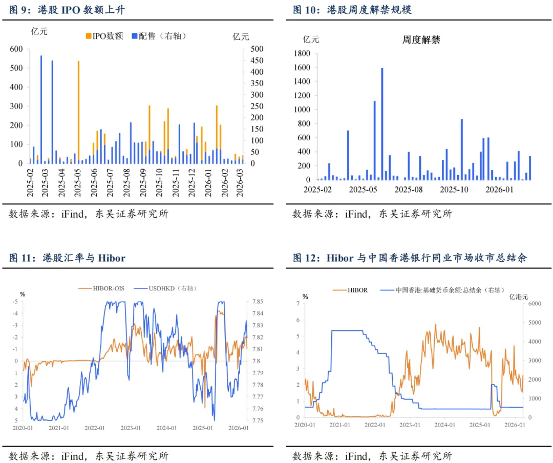 本周港股回购 46 亿元,较上周增加 41 亿元;本周 IPO 数额 40 亿元,比上周增加 7 亿元;增发共 15 亿元,较上周减少 1 亿元;解禁市值为 329 亿元,较上周增加 258 亿元。