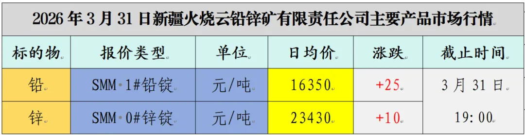 >今日行情 | 2026年3月31日新疆火烧云铅锌矿有限责任公司主要产品市场