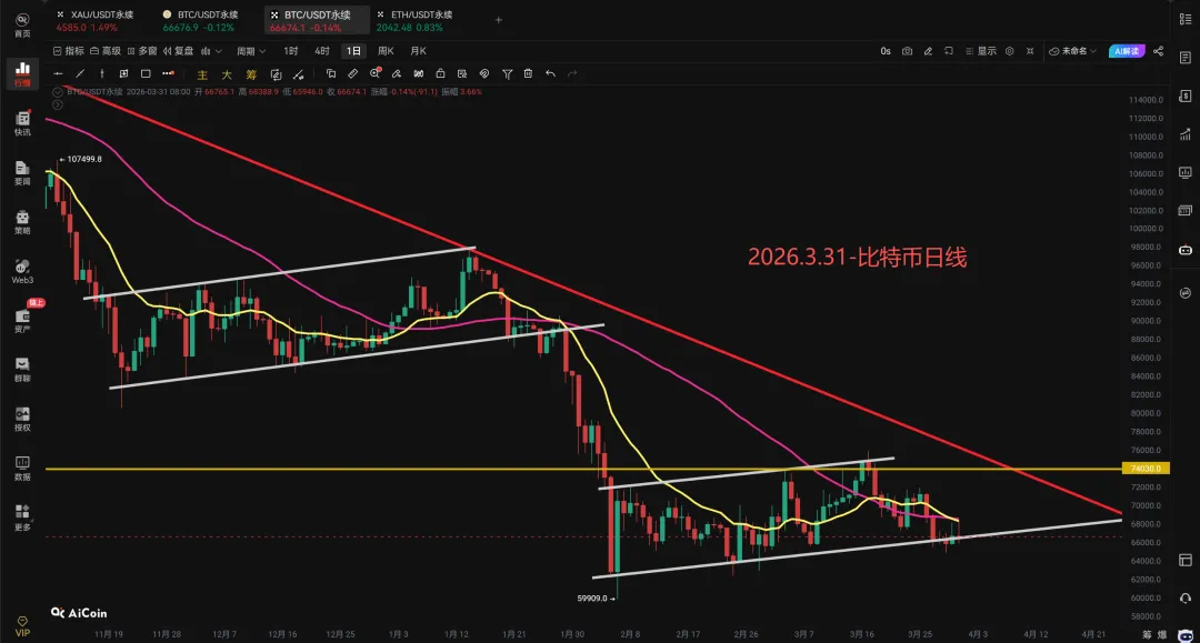现在虽说是空头,但是多头未死,或者说狗庄诱多没完成,它就会继续多次诱多制造假象,严格来讲,多头早就死了,只不过要做多次诱多才能达到大跌的预期效果。日线级别不走出大阴线就不能做空,依然有机会涨到70000,75000,甚至78000。我们也不去猜行情,蜡烛图给了我们什么信号我们就做什么单子,哪怕后面确实突破70000,也可以考虑轻仓做多,能再次涨到75000附近是最好的了,那后面跌起来就会更彻底。