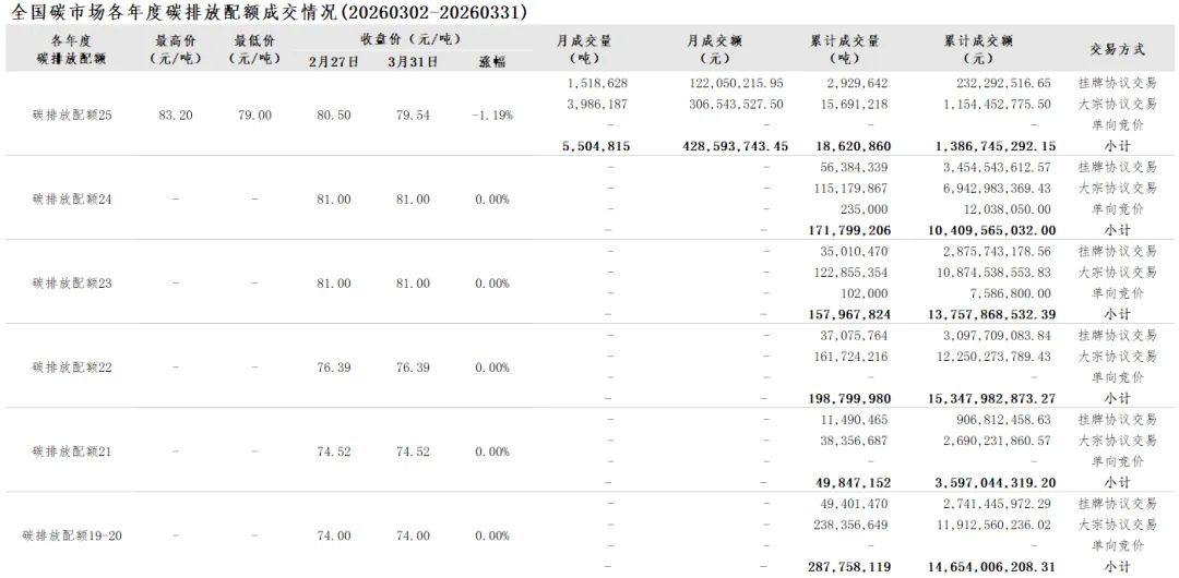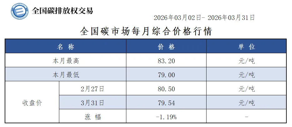当前位置:首页>行情>【CEA月报】全国碳市场每月综合价格行情及成交信息20260302-20260331