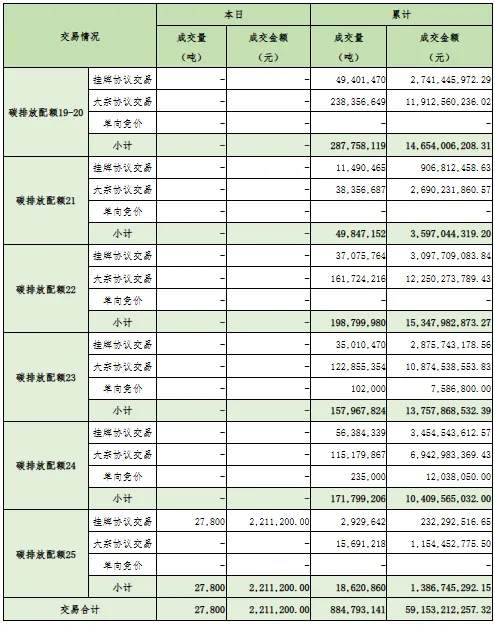 今日全国碳排放权交易市场成交总量27,800吨,成交总额2,211,200.00元,成交均价79.54元/吨。截至今日,全国碳排放权交易市场累计成交总量884,793,141吨,累计成交总额59,153,212,257.32元。