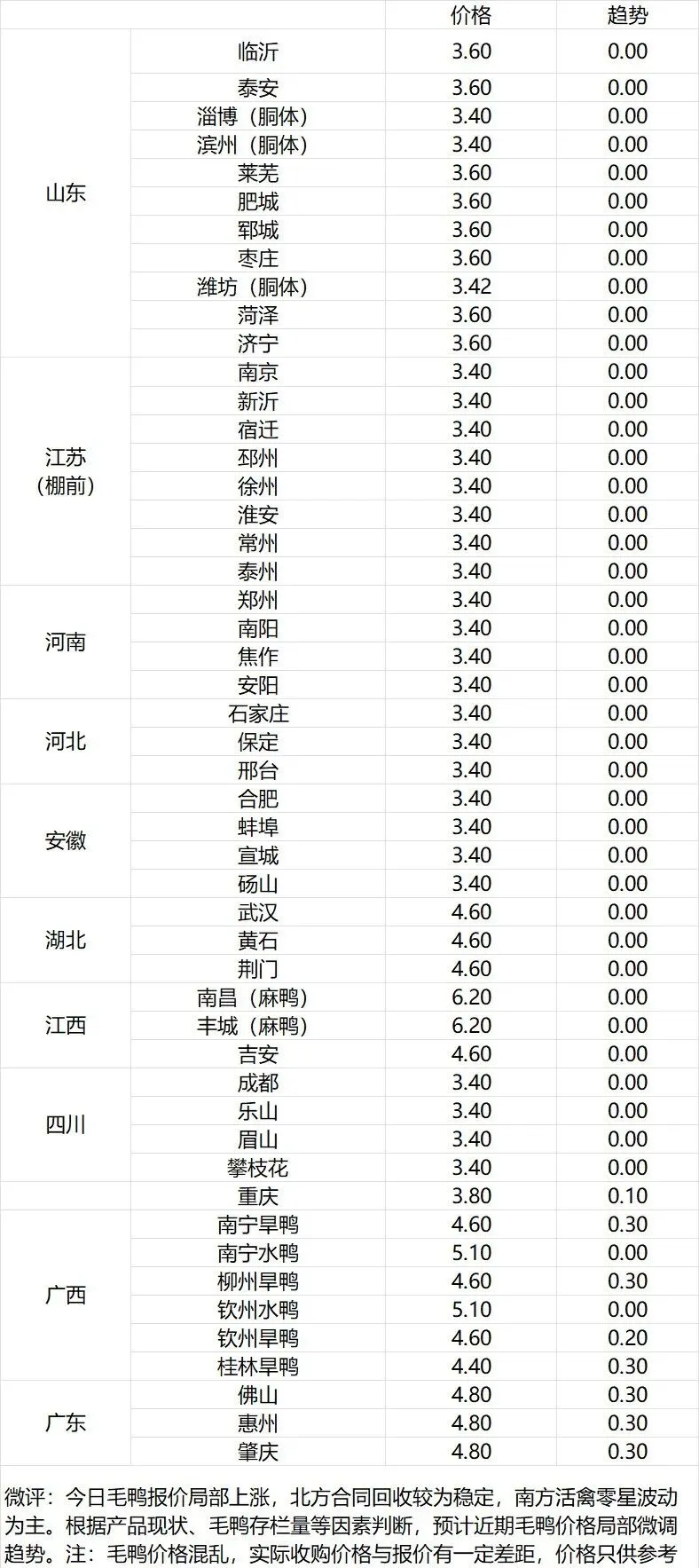 微评:鸭苗报价稳定。(注:南方只报当天价格)苗量少,计划紧张,养殖端成本高企,合同发放量控制。根据产品、养殖成本及鸭苗现状分析,预计近期鸭苗价格呈震荡走低趋势。种蛋报价落5分。温馨提示:该价格为主流厂家报价,实际销售价格以成交价格为准,价格仅供参考。