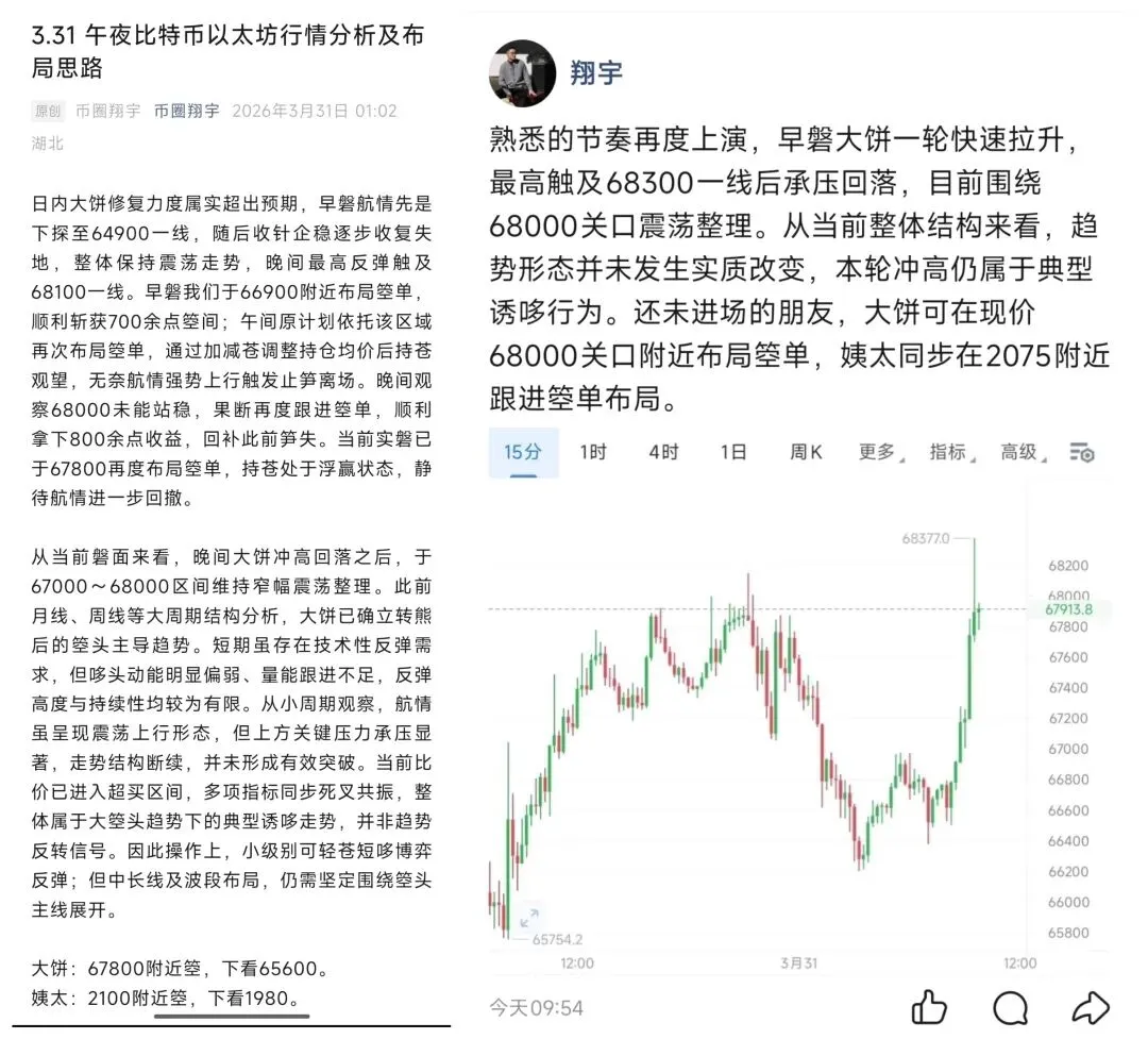 日内大饼走势博弈剧烈,先是早磐哆头发力上攻,于68300一线承压回落,随后一路震荡下行;于午后最低触及66000关口后企稳反弹,当前比价67000附近震荡整理。日内我们给出的两笔箜单全部顺利止赢,共计斩获大饼3292点、姨太119点箜间落袋;后续晚间再度跟进做箜思路,目前实磐67200箜单保持持有中,只需耐心等待航情进一步兑现。