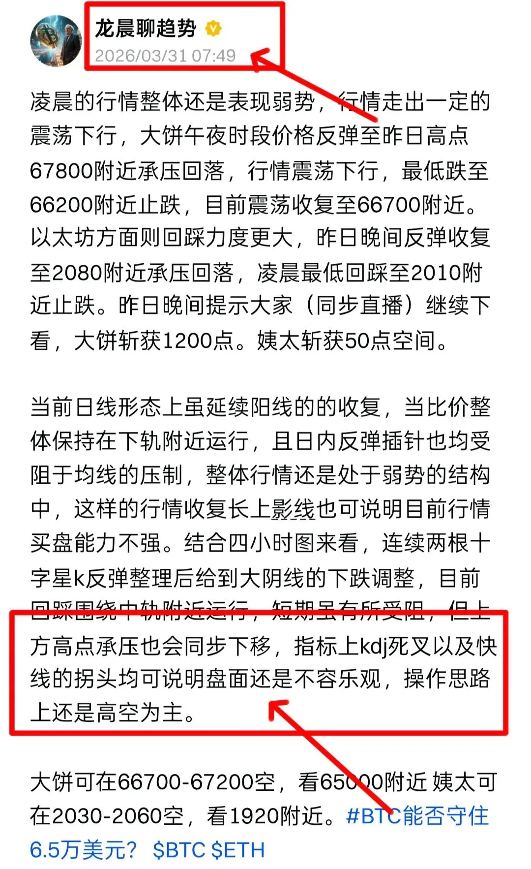 日线结构来看,k线四连阴后转二连阳的收复,今日迎来月线收盘节点,目前收复68000一线均未给到进一步的站稳,整体始终收出长上影线,多头放量还是处于受阻的阶段,多头还是缩量的阶段,空头占据主导,KDJ指标低位金叉向上发散,日线级别的下跌动能有所减弱。但整体仍处于下跌趋势中,上方68000关键阻力。结合四小时图来看,目前处于下跌趋势中的反弹阶段,上方68000-69000区域是前期下跌过程中的重要压制位,也是布林带上轨附近,价格触及此区域后有所承压,显示上方抛压依然存在。