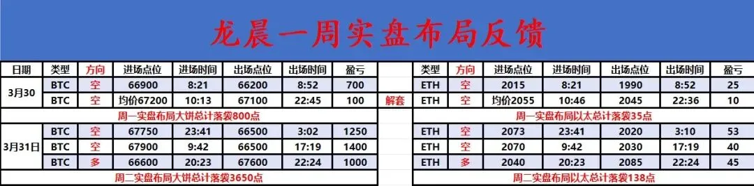 回顾日内行情,今日大饼整体走出震荡上行、冲高整理的走势。凌晨开盘后价格自67000附近稳步走高,早间突破67500关口,午后延续强势,最高触及68377一线,随后小幅回落,日内最低回踩至66000附近后止跌,截至目前尾盘维持在67600上方整理。全天呈现震荡上行格局,早盘至午盘稳步推升,晚间冲高后略有回调,但整体仍站稳67600上方。以太坊方面与大饼走势基本一致,日内反弹收复至2090附近承压,回落,日内最低回踩至2010附近止跌后再度收复,目前最好收复至2090附近盘整。日内我们实盘布局,大饼布局两空一多,大饼斩获3650点空间,姨太总计斩获138点空间。