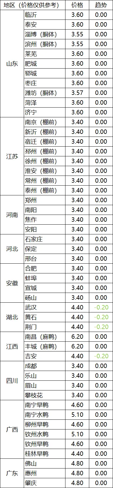 邯郸地区肉毛鸡棚前收购价3.55-3.65元/斤,与31日相比上涨0.10元/斤;