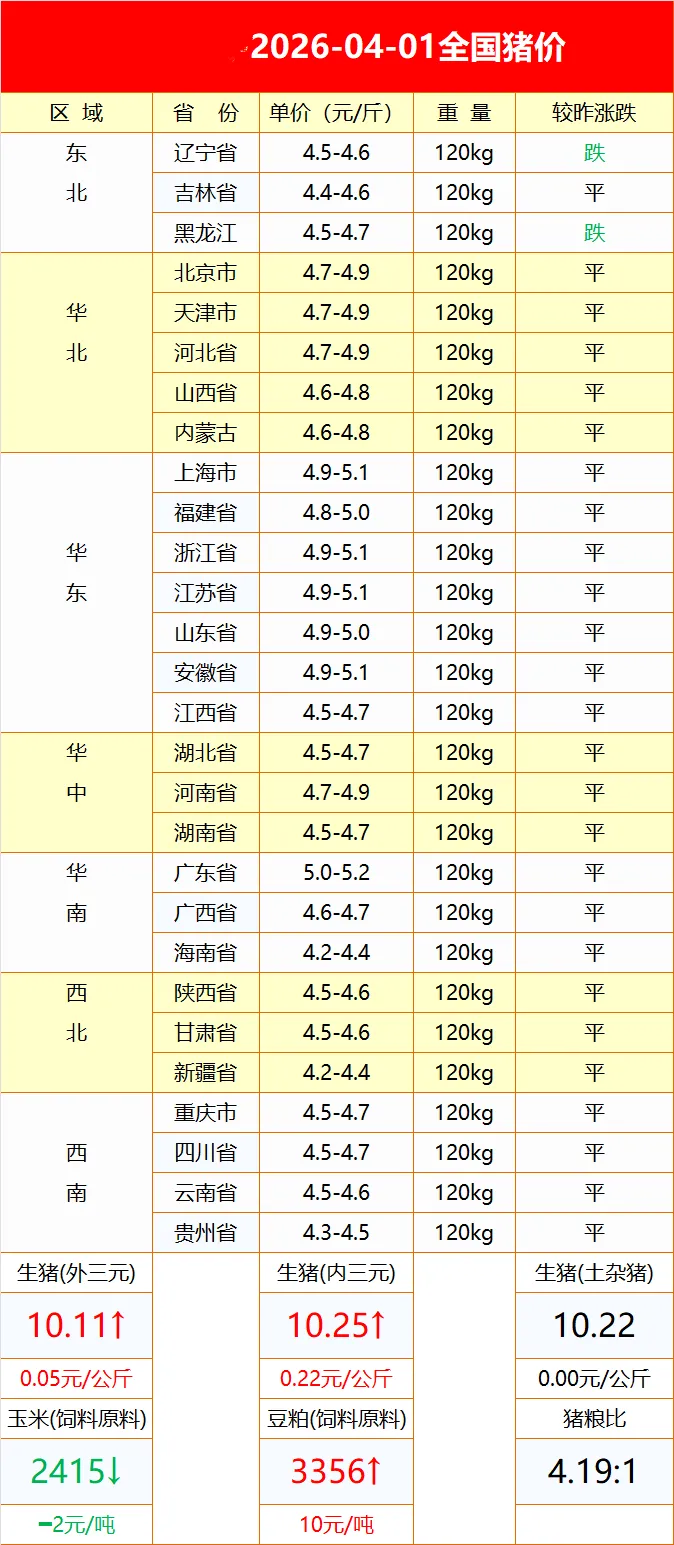 3月31日-4月1日行情报价汇总!(鸡蛋、肉苗鸡、肉毛鸡、鸭价、猪价、玉米、豆粕)