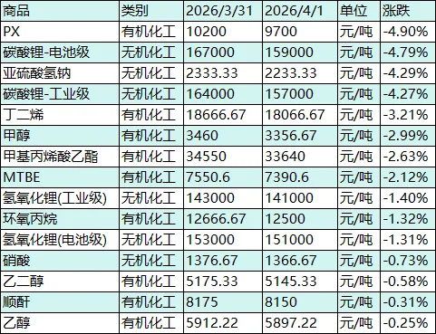 -回调品种集中发力,幅度中等且聚焦细分领域:15种回调品种呈现“PX与锂电材料双核心领跌、其余品种小幅至中幅回调”的特征,回调压力集中于特定板块,未形成全面回调态势。PX(-4.90%)、碳酸锂-电池级(-4.79%)、亚硫酸氢钠(-4.29%)、碳酸锂-工业级(-4.27%)构成第一回调梯队,跌幅超4%,成为今日回调主力;丁二烯(-3.21%)构成第二回调梯队,跌幅超3%;