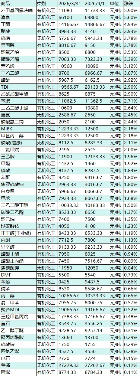 -上涨梯队层次清晰,高幅品种引领局部景气:今日上涨品种呈现“高幅领涨、中幅协同、多数温和普涨”的梯队特征,涨幅分布合理。2-甲基四氢呋喃以5.90%的单日涨幅强势领跑,价格从11080元/吨升至11733.33元/吨,成为今日市场核心亮点;溴素(5.60%)构成第二领涨梯队,涨幅超5%;丁酮(4.94%)构成第三领涨梯队,涨幅接近5%,延续近期高景气态势;