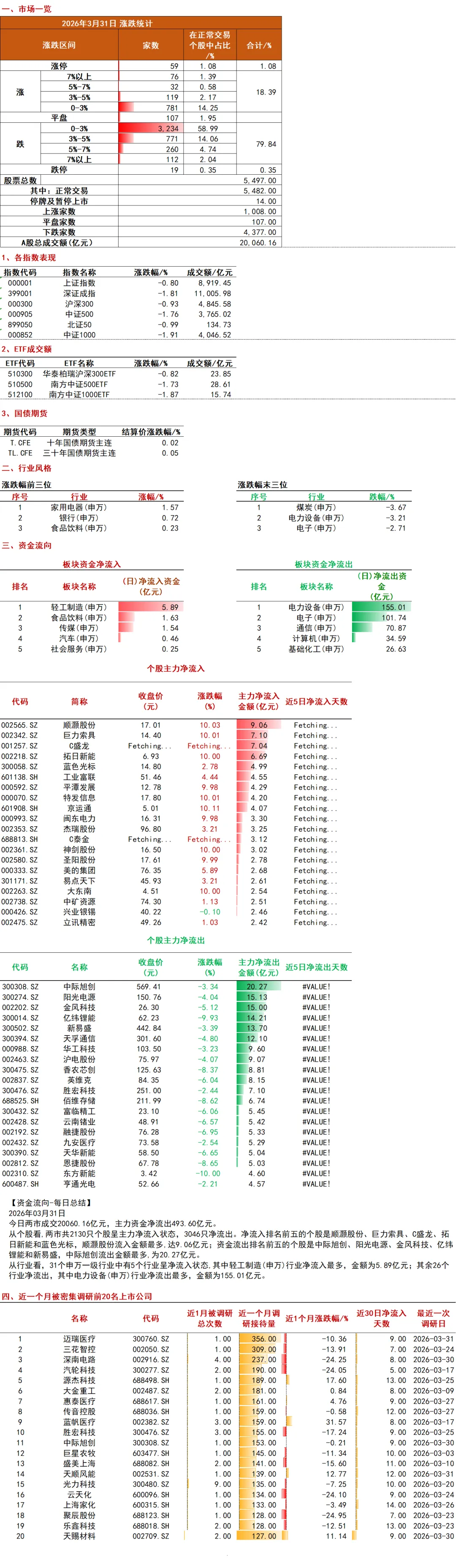 总结今日行情特点:指数集体收跌但权重护盘,资金避险情绪浓厚,板块分化显著。轨道交通、摩托车、CRO逆势活跃,周期资源及科技成长领跌,北向资金连续净卖出,南向资金持续流入港股。市场呈现“沪强深弱”格局,创业板跌幅显著,防御性板块与政策支持领域成为资金避风港,短期需关注量能变化及政策落地效果。