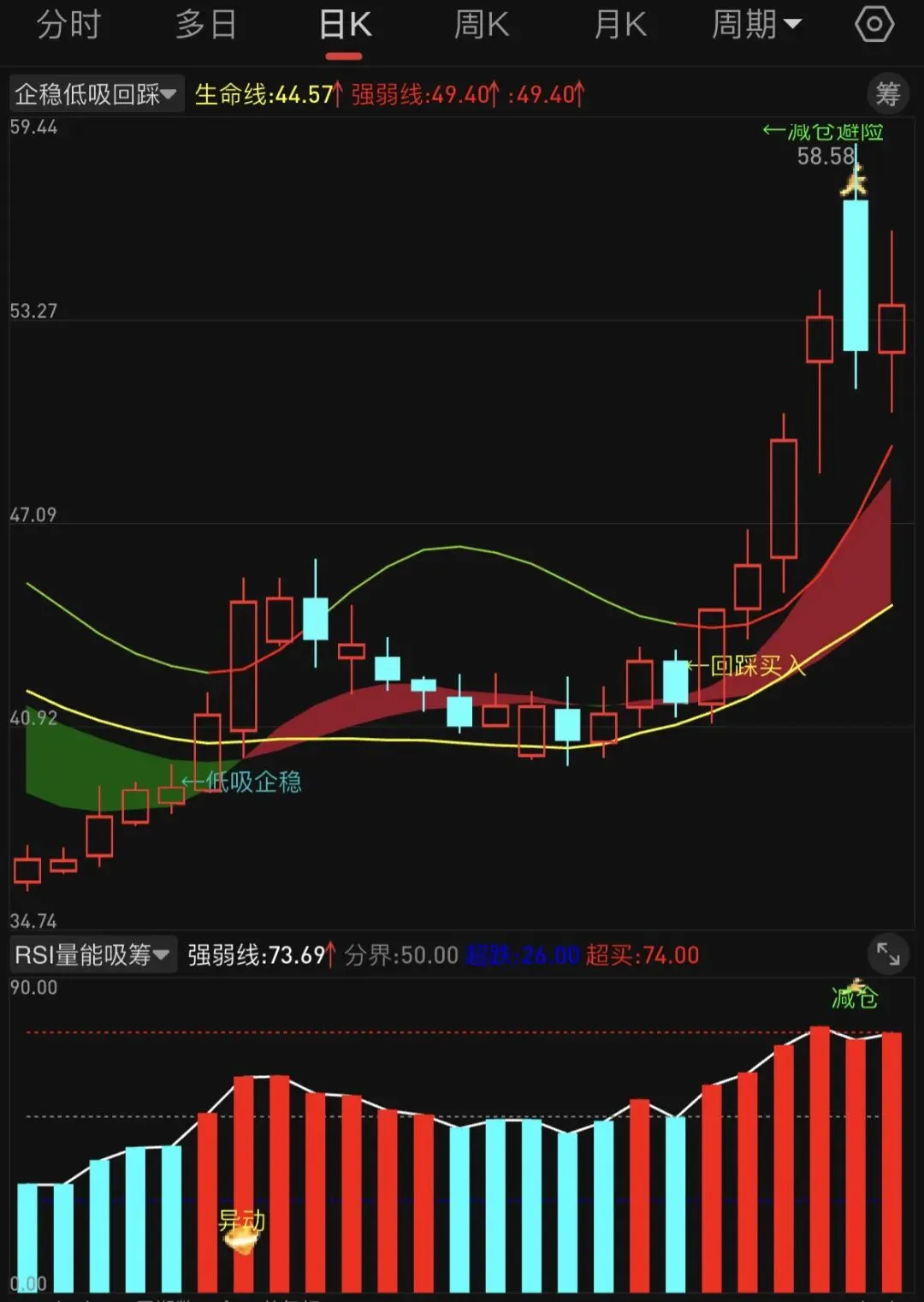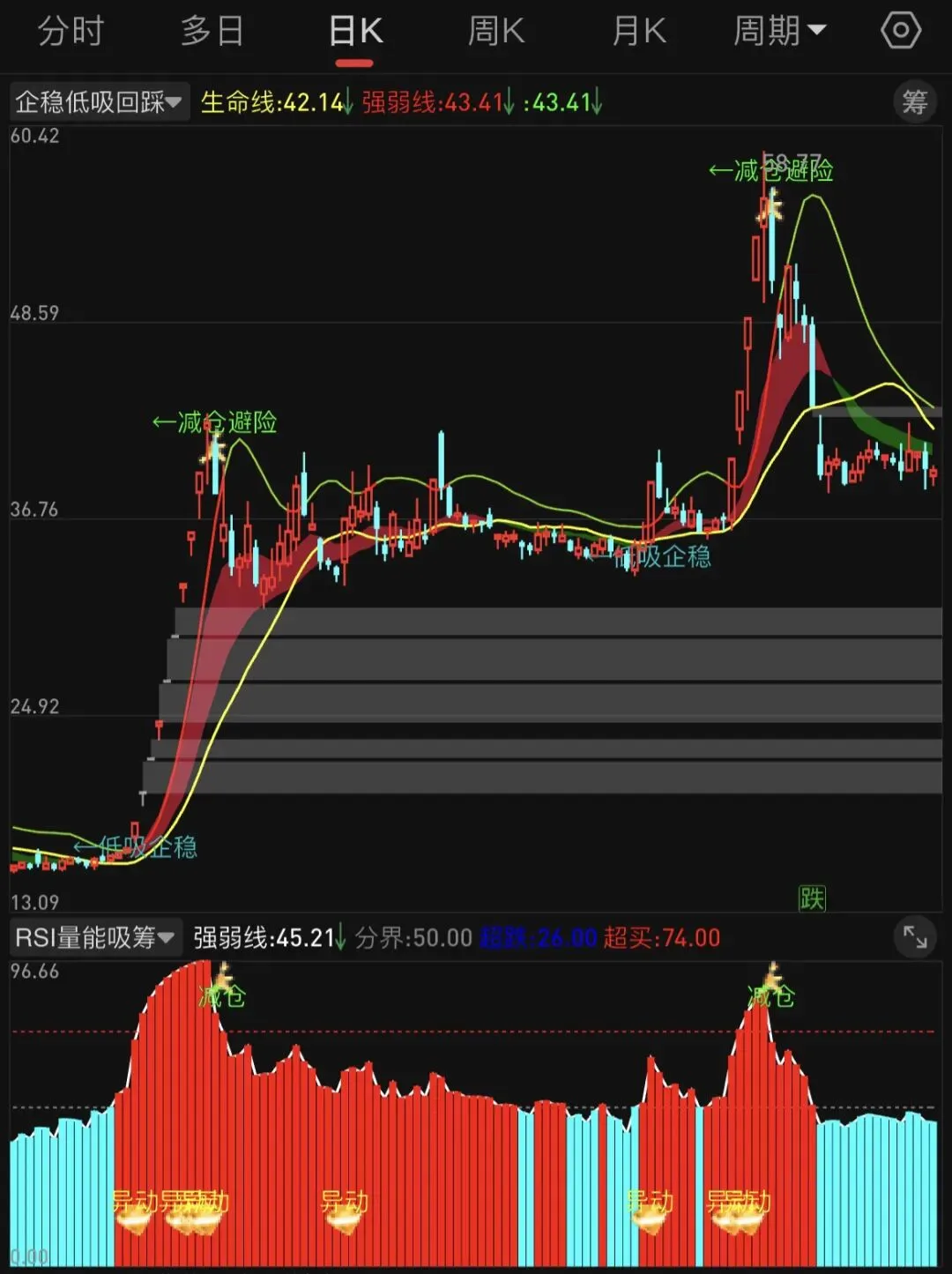 GRZT5:=EMA(GRZT1,8),COLORRED;GRZT6:=EMA(GRZT4,15),COLORBLUE;DRAWBAND(GRZT5,RGB(150,20,40),GRZT6,RGB(0,90,0));GRZT7:=EMA(C,14),COLORWHITE;GRZT8:=(GRZT7-REF(GRZT7,1))/REF(GRZT7,1)*100,NODRAW;GRZT9:=IF(GRZT8>=0,EMA(C,14),DRAWNULL),COLORRED,LINETHICK2;GRZT10:=IF(GRZT8<0,EMA(C,14),DRAWNULL),COLORGREEN,LINETHICK2;生命线:MA(C,20),COLORYELLOW,LINETHICK2;GRZT11:=REF(EMA((H+L+C)/3,10),1);GRZT12:=EMA(LLV(LOW,10),3);强弱线:EMA(GRZT11*2-GRZT12,5),COLORRED,LINETHICK2;IF(C>强弱线,强弱线,DRAWNULL),COLORRED;IF(C<强弱线,强弱线,DRAWNULL),COLORGREEN;GRZT14:=CROSS(C,强弱线) AND C>O AND VOL>GRZT13*1.3 AND 强弱线>REF(强弱线,1) AND GRZT5>GRZT6;GRZT15:=BARSLAST(GRZT14);GRZT16:=GRZT14 AND COUNT(GRZT14,20)=1;GRZT20:=SMA(MAX(C-GRZT19,0),GRZT18,1)/SMA(ABS(C-GRZT19),GRZT18,1)*100;GRZT21:=C>生命线 AND C>强弱线 AND GRZT20>70 AND REF(GRZT20,1)>GRZT20 AND C/LLV(C,20)>1.2;GRZT23:=C/REF(C,1)>=1.098 AND C=H;GRZT24:=L<=强弱线*1.01 AND C>=强弱线 AND C>O AND GRZT5>GRZT6 AND 强弱线>REF(强弱线,1) AND GRZT8>0;GRZT25:=GRZT24 AND GRZT15>3 AND GRZT15<20 AND NOT(GRZT23) AND GRZT20<70 AND C/LLV(C,13)<1.35;GRZT26:=GRZT25 AND COUNT(GRZT25,15)=1;DRAWTEXT(GRZT16,L*0.98,'←低吸企稳'),COLORLIBLUE;DRAWTEXT(GRZT26,L*0.98,'←回踩买入'),COLORYELLOW;DRAWICON(GRZT22,H*0.98,15);DRAWTEXT(GRZT22,H*1.02,'←减仓避险'),COLORGREEN;GRFT4:=SMA(MAX(C-GRFT3,0),GRFT2,1)/SMA(ABS(C-GRFT3),GRFT2,1)*100;GRFT7:=GRFT6>1.7 AND C>O AND GRFT4>GRFT5;GRFT8:=GRFT4<35 AND C>REF(C,1) AND VOL>REF(VOL,1) AND C>MA(C,20);GRFT9:=CROSS(GRFT4,26) AND C>MA(C,20);强弱线:GRFT4,COLORWHITE,LINETHICK2;分界:GRFT5,COLORGRAY,DOTLINE;STICKLINE(强弱线>分界,0,强弱线,2,0),COLORRED;STICKLINE(强弱线<分界,0,强弱线,2,0),COLORCYAN;DRAWTEXT(GRFT8,12,'吸筹'),COLORWHITE;DRAWTEXT(GRFT7,20,'异动'),COLORYELLOW;DRAWTEXT(GRFT9,7,'反弹'),COLORRED;DRAWTEXT(GRFT10,85,'减仓'),COLORGREEN;GRXG1:=EMA(C,2);