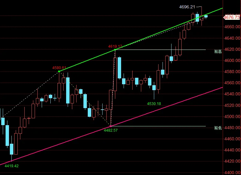 从技术面来看,日线级别此根大阳线彻底扭转了前期短期弱势回落的格局,下影线较长说明下方4482一线买盘支撑力度强劲,多头在低位承接意愿强烈,价格企稳后快速反弹彰显出多头反攻的决心;而小幅上影线则表明上方4687附近存在短期抛压,价格冲高后遭遇部分获利了结盘打压。均线系统方面,短期5日均线快速拐头向上,并且即将上穿10日均线形成金叉,多头趋势逐步显现,中期均线依旧保持平稳运行,价格重回均线组上方,意味着短期走势由弱转强,多头占据主导地位。同时,布林带轨道呈现开口向上的迹象,价格从布林带下轨附近一路拉升至中轨上方,且逐步向布林带上轨靠拢,短期上行通道打开,后续若能站稳布林带中轨,进一步冲高的概率较大。