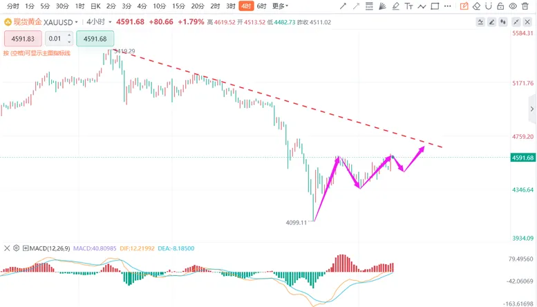 小时级别呈强势震荡上行,短周期均线多头排列,价格依托均线运行。布林带向上开口,价格沿上轨附近运行,布林中轨(4600美元)转为重要支撑,不破则多头仍有新高动能。MACD双线高位放量,无明显死叉,需警惕高位顶背离引发的回落,小时图呈阶梯抬升的典型多头节奏。