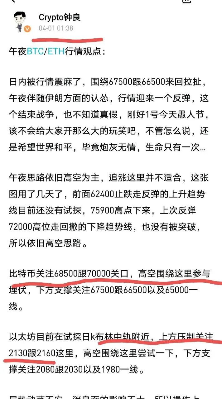 比特币午夜再次给到大家高空思路,让大家莫追涨,虽然伊朗方面表示认怂,行情迎来一波反弹,比特币让68500高空,以太坊2120高空,行情也是反弹给到了上车机会,最高68600跟2124一线,可谓是最高位的空,现在价格67800跟2095一线,空单也都是有利润的,跑短线的选手,可以分批减仓,继续往下博更大的利润。
