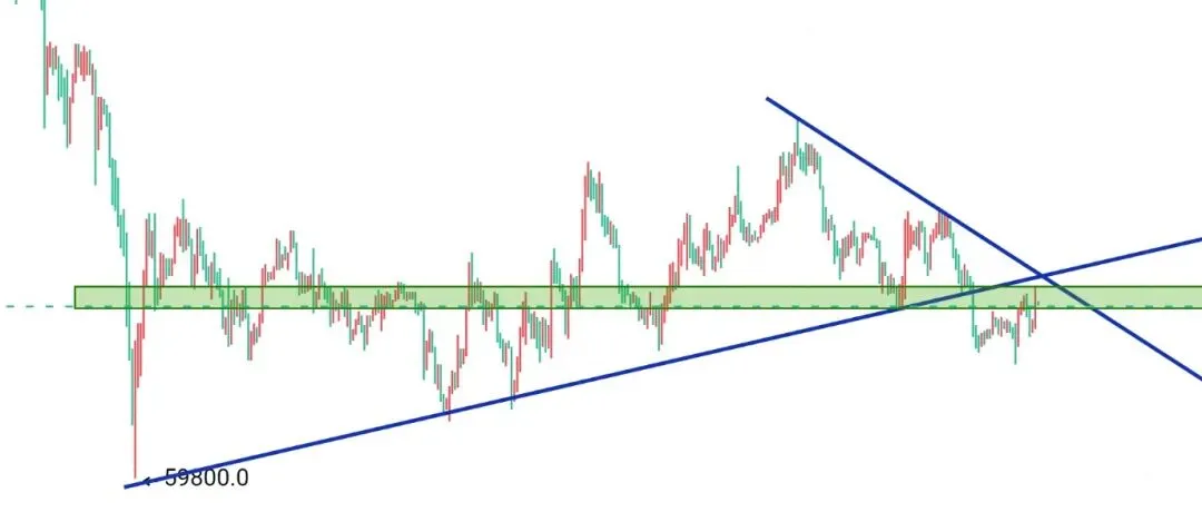 4小时级别,价格受压布林带上轨压制,KDJ跟RSI均高位拐头向下。小时图级别受压更是明显,MACD出现顶背离,多头量能持续缩量。如这几天每天的图所示,从76000受压下来的下降趋势线没破,从底部62400反弹的上升趋势线跌破以后,价格也未能有效突破站稳,价格始终在这跟趋势线下方,所以操作上逢高做空!