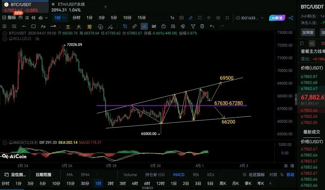 比特币(BTC)今日行情分析:1小时级别当前价格在上升通道内震荡,处于通道中轨附近,同时在67630-67280关键支撑区间上方运行。