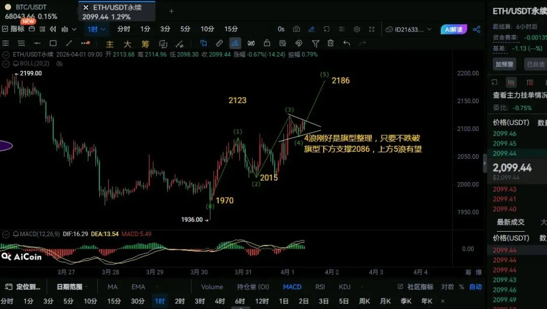 以太坊(ETH)今日行情分析:1小时级别当前价格处于4浪旗型整理结构中,旗型下沿支撑为2086,上方目标为5浪高点2186。