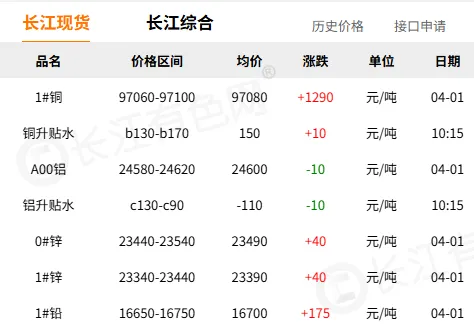 >【今日铜价】04月01日长江有色1#铜行情播报