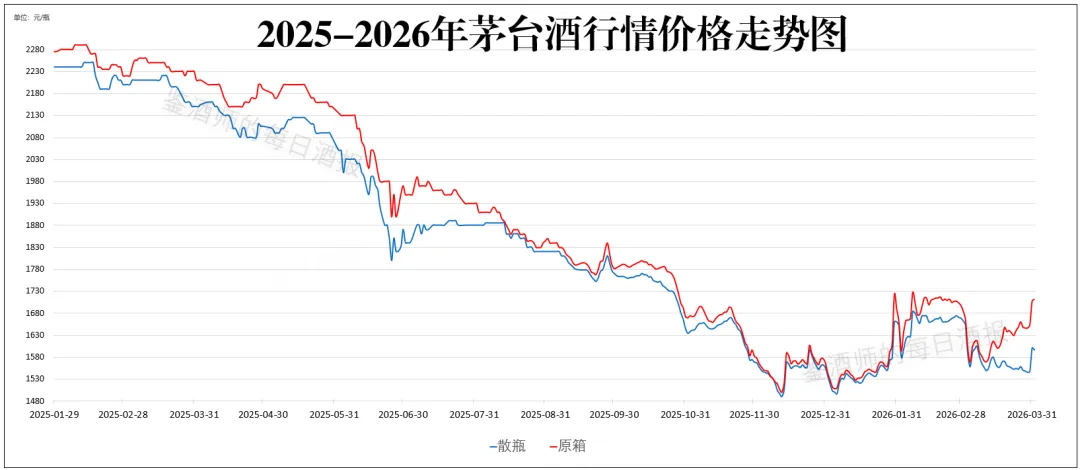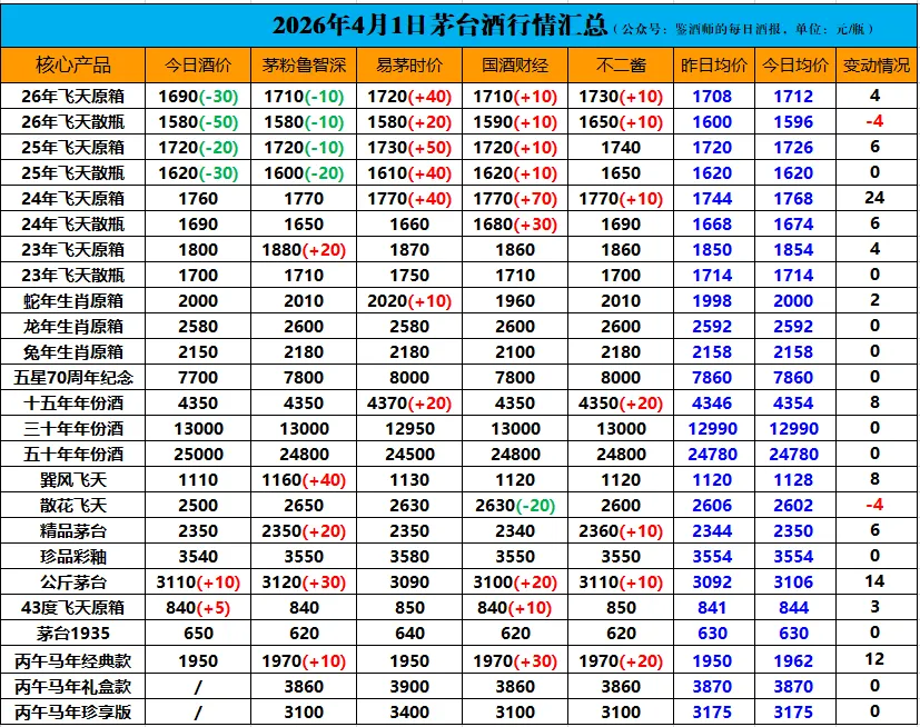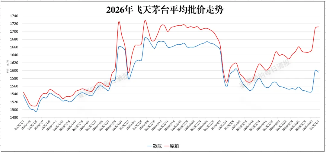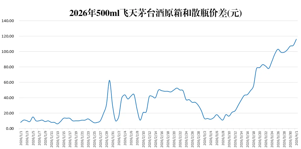 2026年4月1日飞天茅台原箱(1712)与散瓶(1596)价差为116元,较昨日价差扩大8元,再创年内新高。2026年4月1日茅台行情价格监测数据: