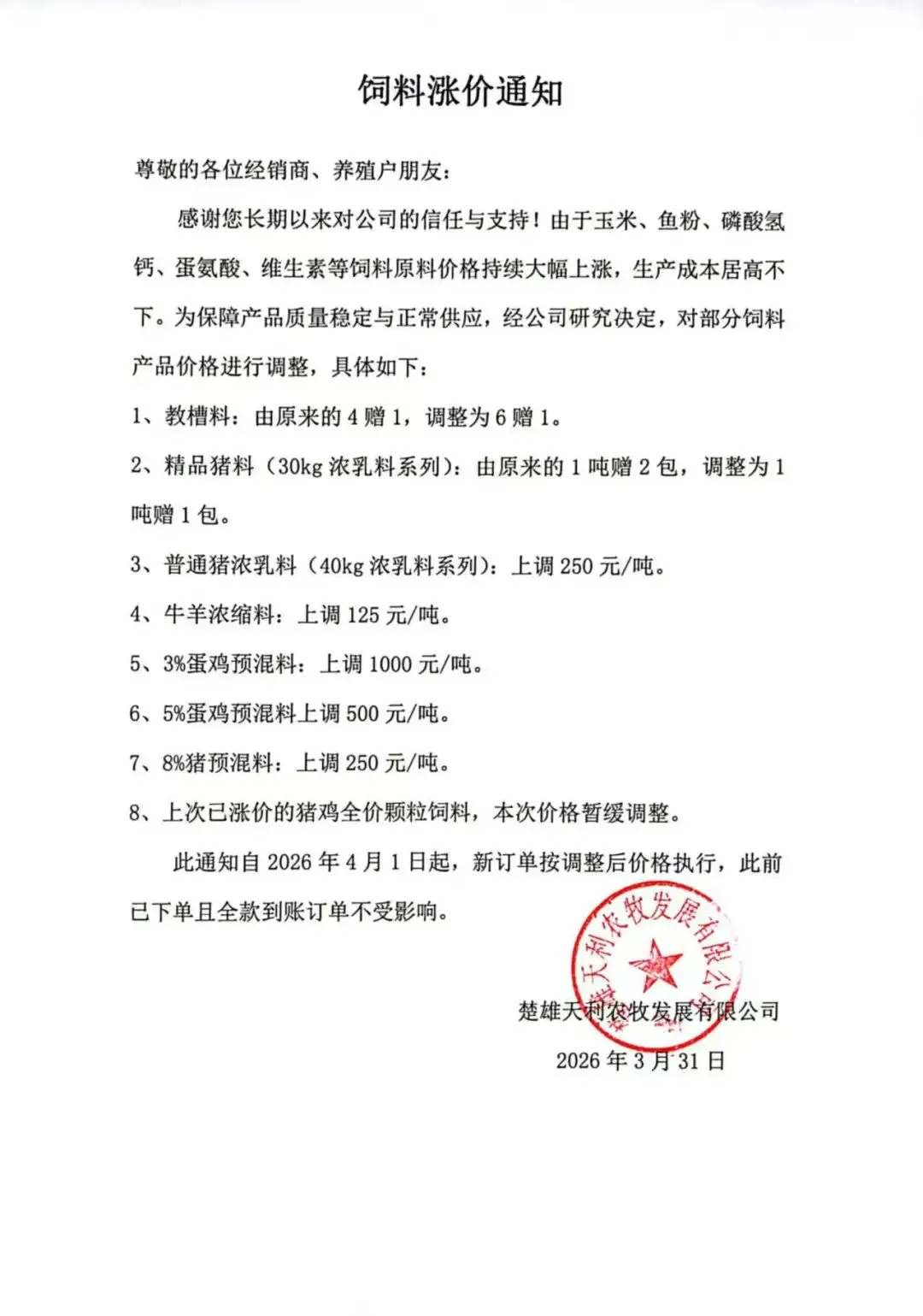 近期,玉米、鱼粉、磷酸氢钙、蛋氨酸、维生素等核心饲料原料价格持续大幅攀升,导致公司生产成本居高不下。为坚守产品品质底线,保障饲料质量稳定与市场正常供应,经公司研究决定,自2026年4月1日起,对部分饲料产品价格及优惠政策进行调整,具体如下: