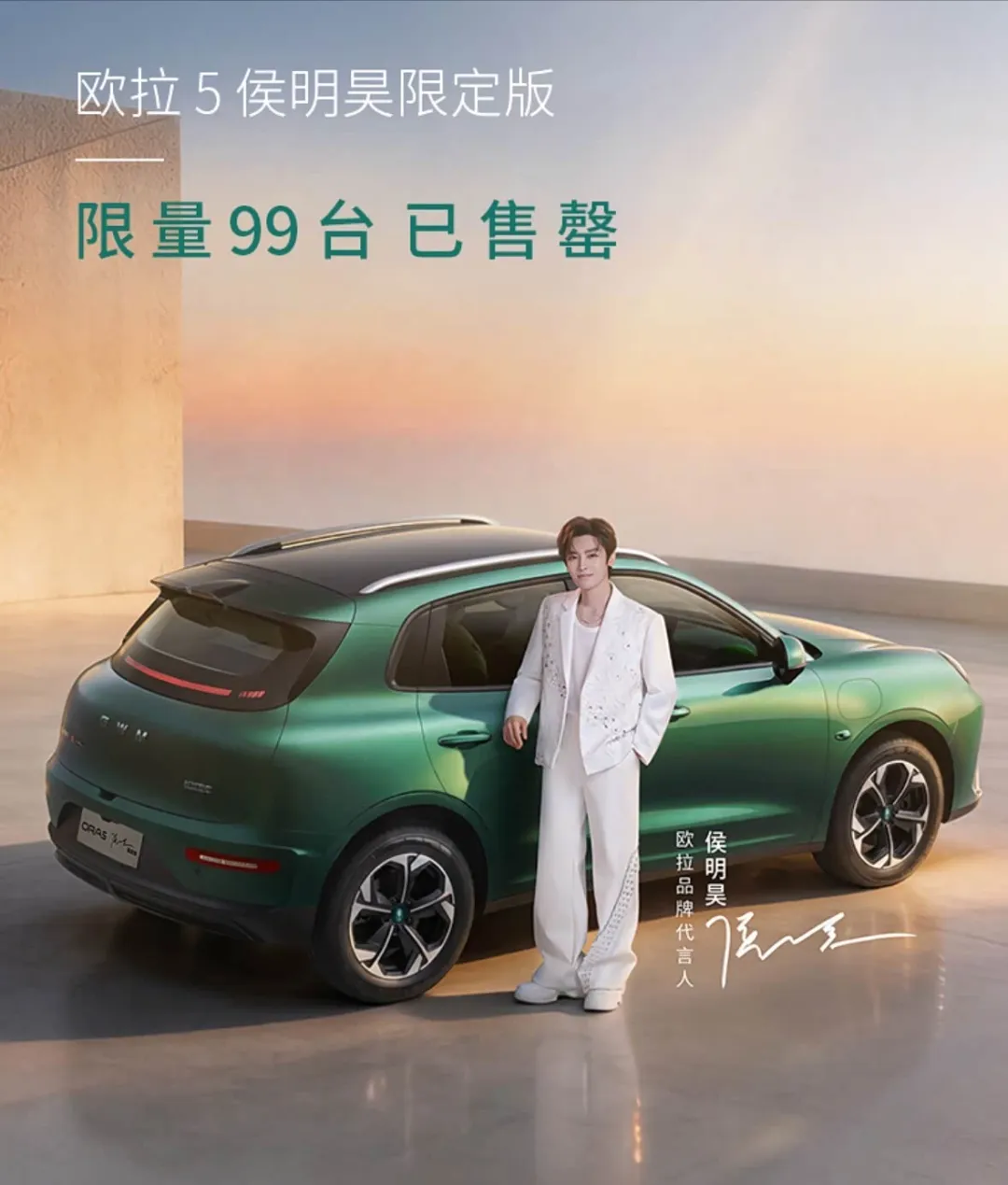 从新车命名也可以看出,该车是一款特别版车型,以代言明星名字命名,不仅只推出了99台,还可享侯明昊亲自交付,上市就已抢购一空。该车外观不用过多介绍,与在售的欧拉 5 保持一致,搭载全新现代绿车漆,同时提供专属刺绣、专属壁纸、专属签名尾标,以及全新样式轮毂等。新车保持4471mm车长不变,搭载峰值150kW前置驱动电机,提供最高580km纯电续航。
