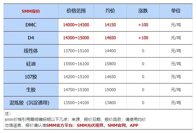 价格:DMC:昨日成交价格13800元/吨-14300元/吨,环比持稳。在经历成交价格的小幅波动之后,多数下游客户已完成阶段性采购需求,部分上游单体企业在当前预售排单较充裕下,自上周四开始,逐步进入封盘状态,待行业会议后再正常报价。D4:昨日报价14100元/吨-15000元/吨,环比持稳。107胶:昨日报价14200元/吨-15100元/吨,环比持稳。生胶:昨日报价14700元/吨-15300元/吨,环比下调100元/吨。硅油:昨日报价15500元/吨-16100元/吨,环比持稳。